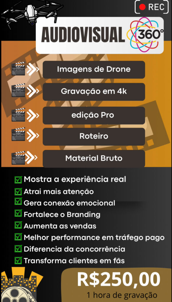 Imagens aéreas com drone Criação de roteiro e narrativas Áudio visual impactante (Rels oferta) Edição 4k alta performance Material bruto
